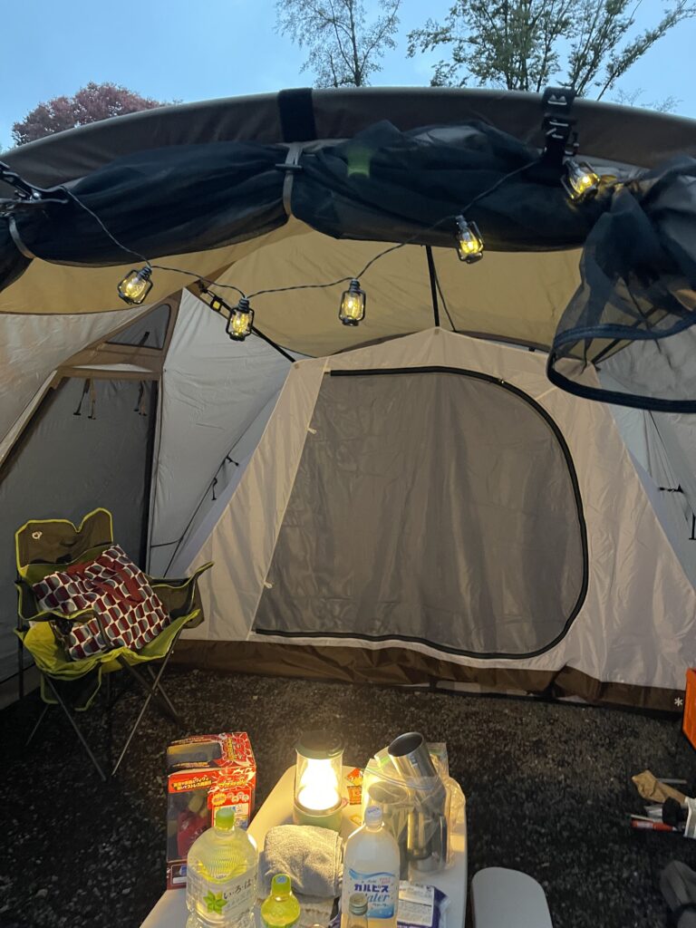 特に上からつるせる照明が必要だったので、私たちはテントについている棒にライトをつけて代用しましたので、もっとたくさんライトを持ってくればよかった〜と思いました!